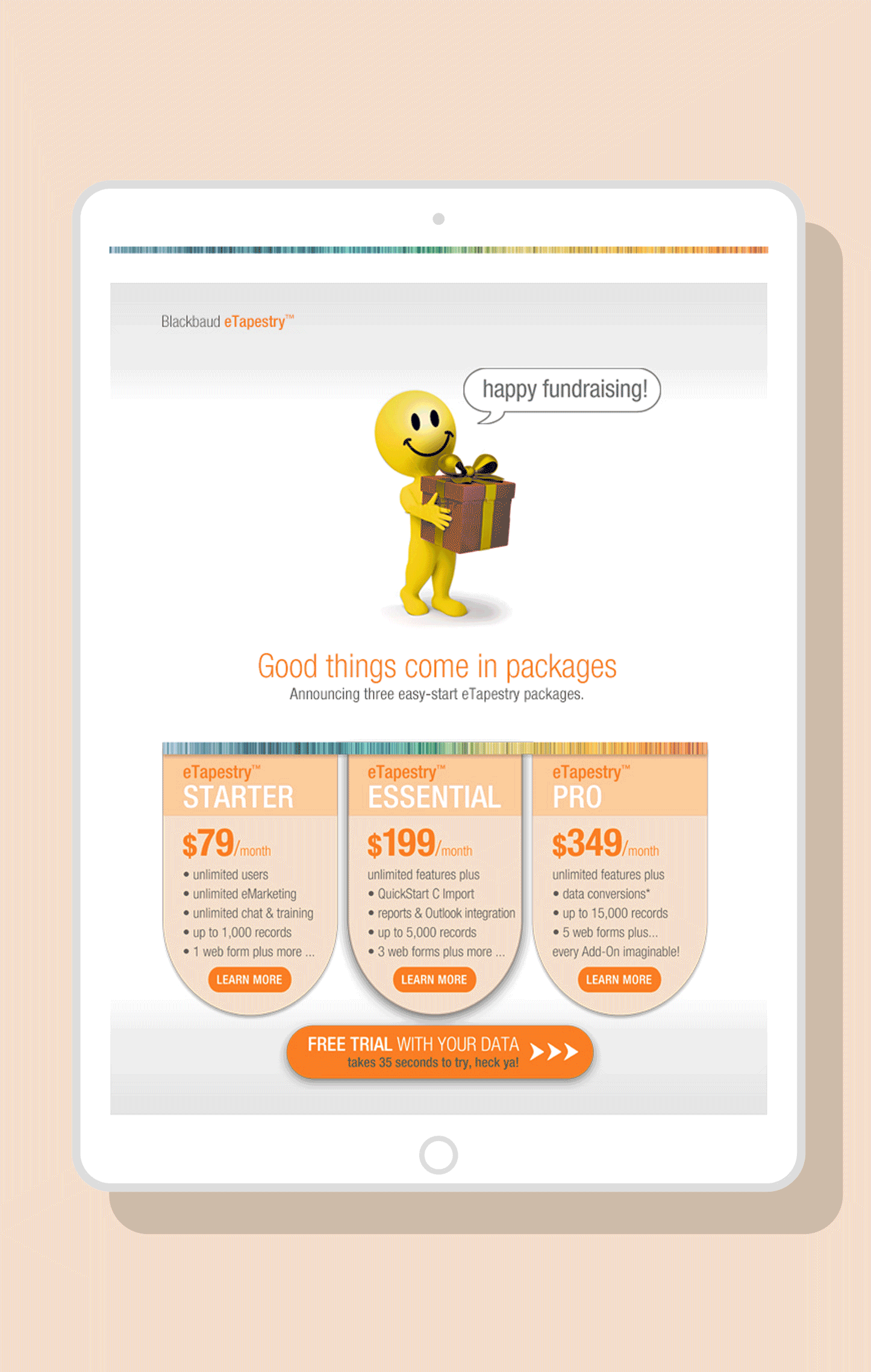 HAPPY MAN Happy Fundraising! Tasked with creating a mascot for Blackbaud’s new suite of eTaspestry packages (easy-to-use, fundraising software), it was Happy Man to the rescue! Happy Man is an approachable spokesmodel, created from stock imagery, turned yellow plus a “smiley face”, The blank stock figure provided endless possibilities for years of marketing messages. Happy Man helps spread the word. “Let’s put the FUN back in fundraising!” BRAND CAMPAIGN