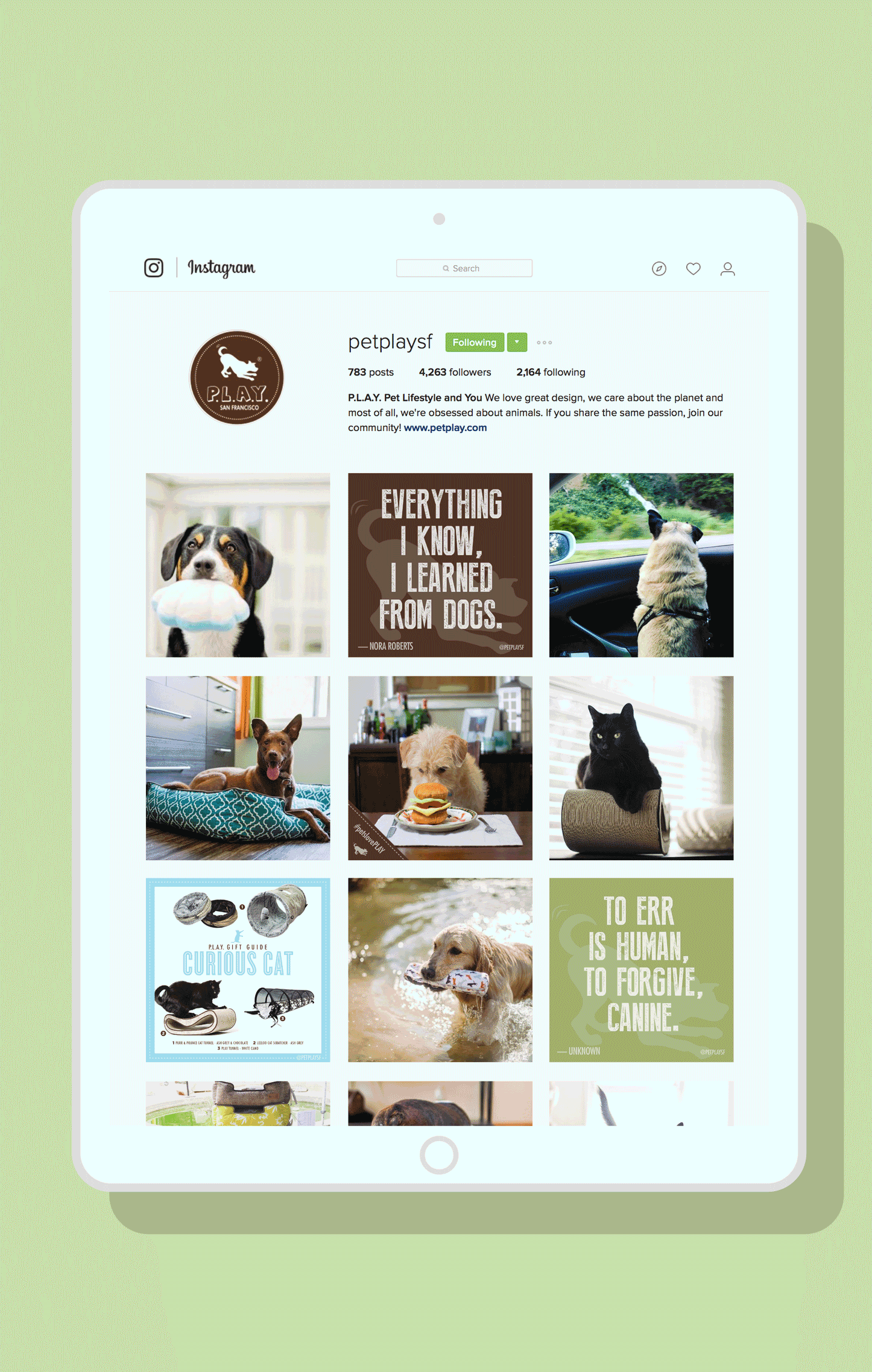 PET P.L.A.Y. San Francisco’s P.L.A.Y. creates fab dog beds and dog toys and their branding is bold and memorable already… but their social needed an injection of fun. I created an instagram strategy with in-house templates, schedules, concepts and on-brand do-dads including dog quotes. In the months that followed, P.L.A.Y’s. instagram grew from 4K followers to over 40K and continues to be the place to meet for playful dogs and their people. I also had a lot for fun creating totebag art and mid-century styled packaging and patterns. SOCIAL MEDIA TEMPLATE DESIGN / ILLUSTRATION / PACKAGING / PATTERNS