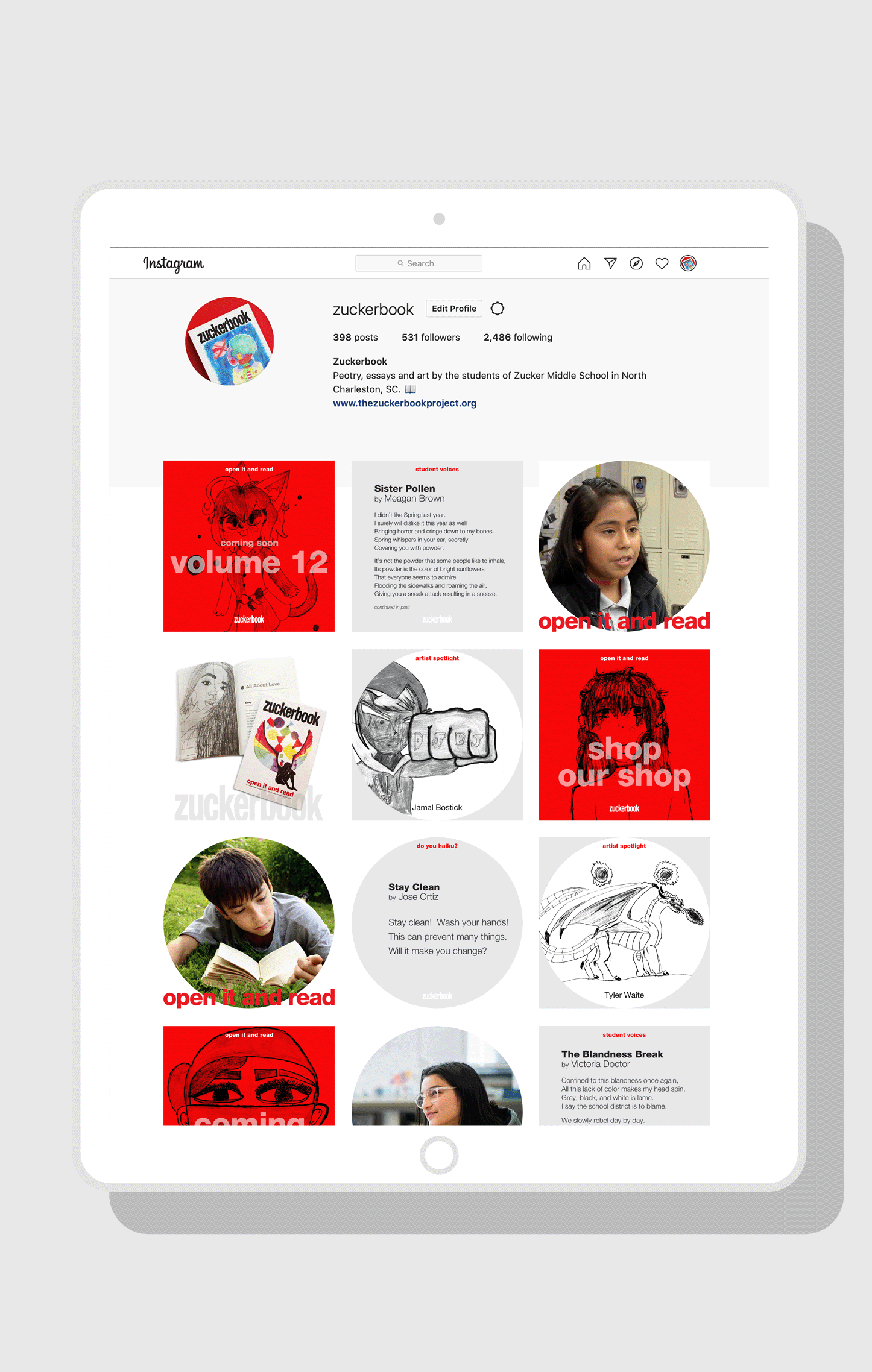 ZUCKERBOOK Zuckerbook is a bi-annual book of poetry and essays, written, illustrated and self-published by the students of Zucker Middle School in North Charleston, SC. Twice a year I produce the 200-page paperback book layout. In addition I’ve designed social media and sales templates for student use and their online shop setup. The book itself is filled with teen angst written in honest, dangerous language from teenagers at a Title One public school. Get yours at zuckerbook.square.site Open it and Read! BOOK DESIGN / SOCIAL MEDIA TEMPLATES / PHOTOGRAPHY