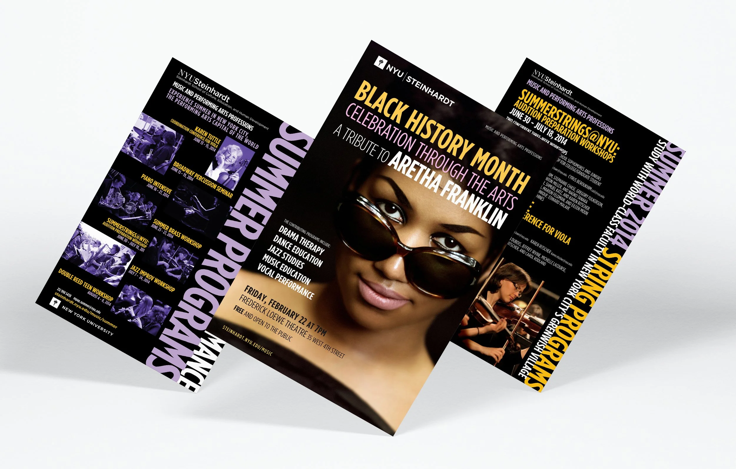 01 NEW YORK UNIVERSITY The NYU Music and Performance Arts Professions programs include 11 departments which produce student performances and events. The show must go on - with a little help from print and digital promo! POSTER DESIGNS • CALENDAR BOOKLETS • SHOW PROGRAMS • EXHIBIT BANNERS • CURRICULUM MATERIALS